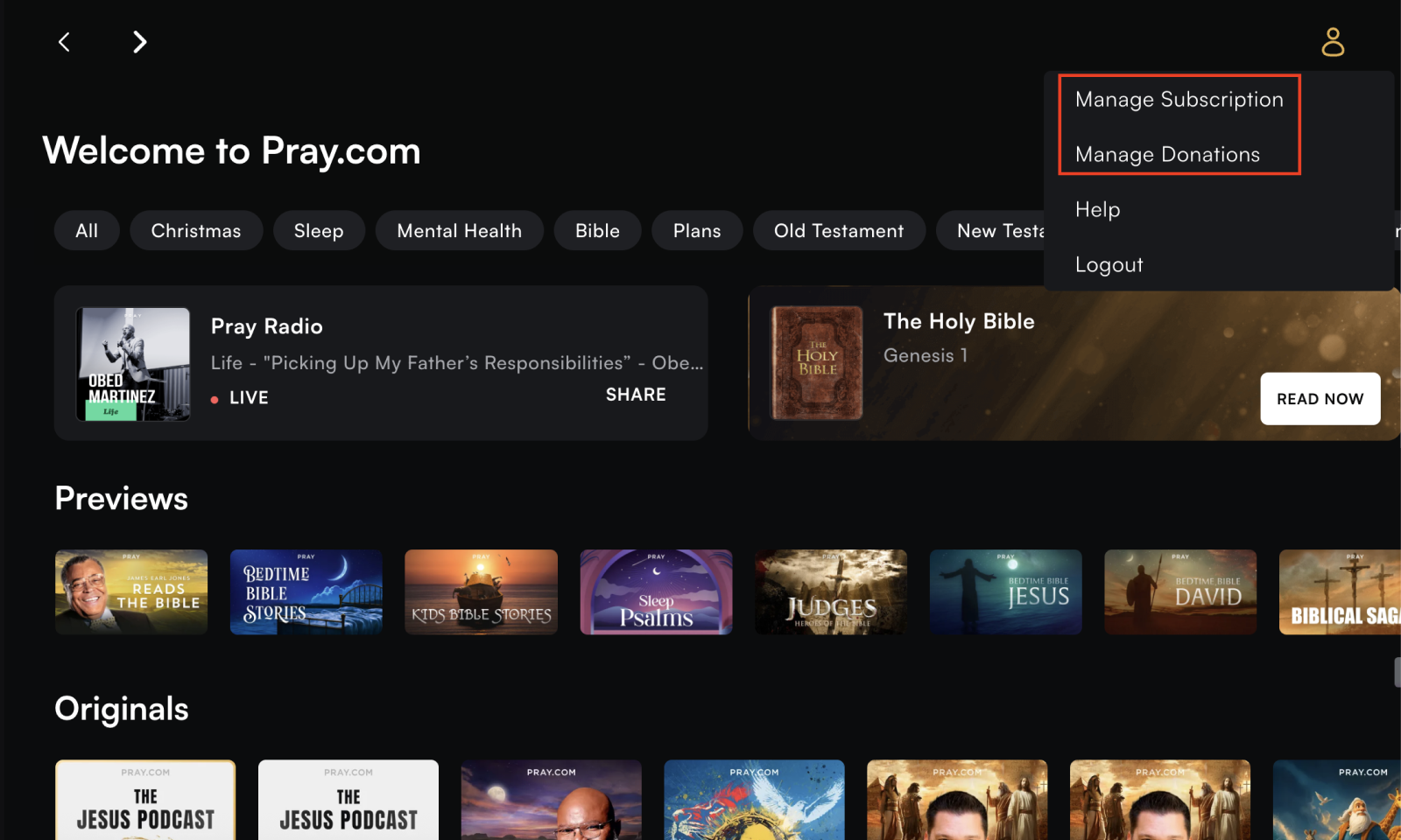 Step 2. Hover over the profile icon in the upper right corner and select "Manage Subscription or Manage Donation."
